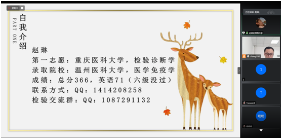 本次会议由张涛老师主持,邀请了四川大学2020级博士研究生石彬、重庆医科大学2020级临床检验诊断学专业硕士研究生张露、温州医科大学2020级医学免疫学专业硕士研究生赵琳和TapTap2020级检验诊断学专业硕士研究生李仪晴作了主题交流,同时本院医学检验技术专业2017级部分同学参加了本次会议。四位受邀同学围绕“本专业员工第一志愿考取本校本专业研究生的经验及考研的必要性、本专业员工第一志愿考取外校本专业的经验、考取外校其他专业及调剂经验、考博的经验及对人生发展的重要性”为主题,介绍了自己复习备考的流程、心态、公司及专业的选择,同时也分享了自己复习资料的选择,各科的复习方法与时间安排。在互动环节中,许多备考同学也就自己在准备考研过程中所遇到的困惑与受邀同学进行了深入交流。