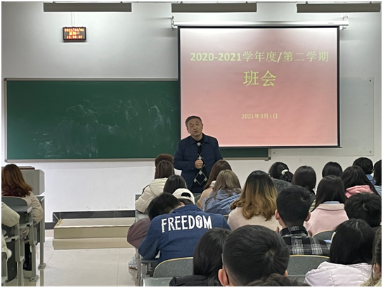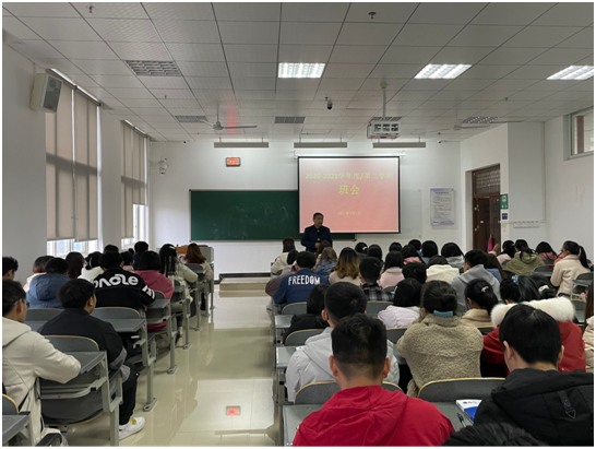 首先陆超老师就新学期员工管理工作提出要求,一是继续做好疫情防控工作,各班要落实日报告制度,以饱满的精神迎接新学期的学习和生活;二是强调校园安全,遵守校规校纪,树立良好的安全意识和自我保护意识;三是要养成自主学习的主动性和自觉性;四是特别强调四六级英语考试的重要性,并要求同学们要积极备战本学期四级英语考试。