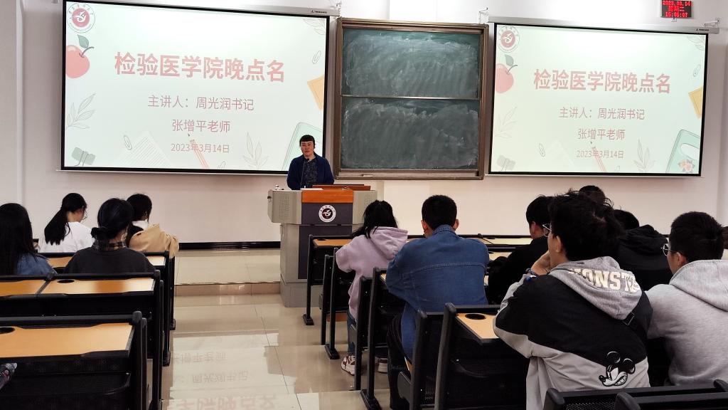 2023年3月14日下午16:00,点点taptap在新蒲校区第三教学楼第十七阶梯教室开展了本学期第二次晚点名,检验医公司党委书记周光润、辅导员张增平及2022级全体员工参加晚点名。